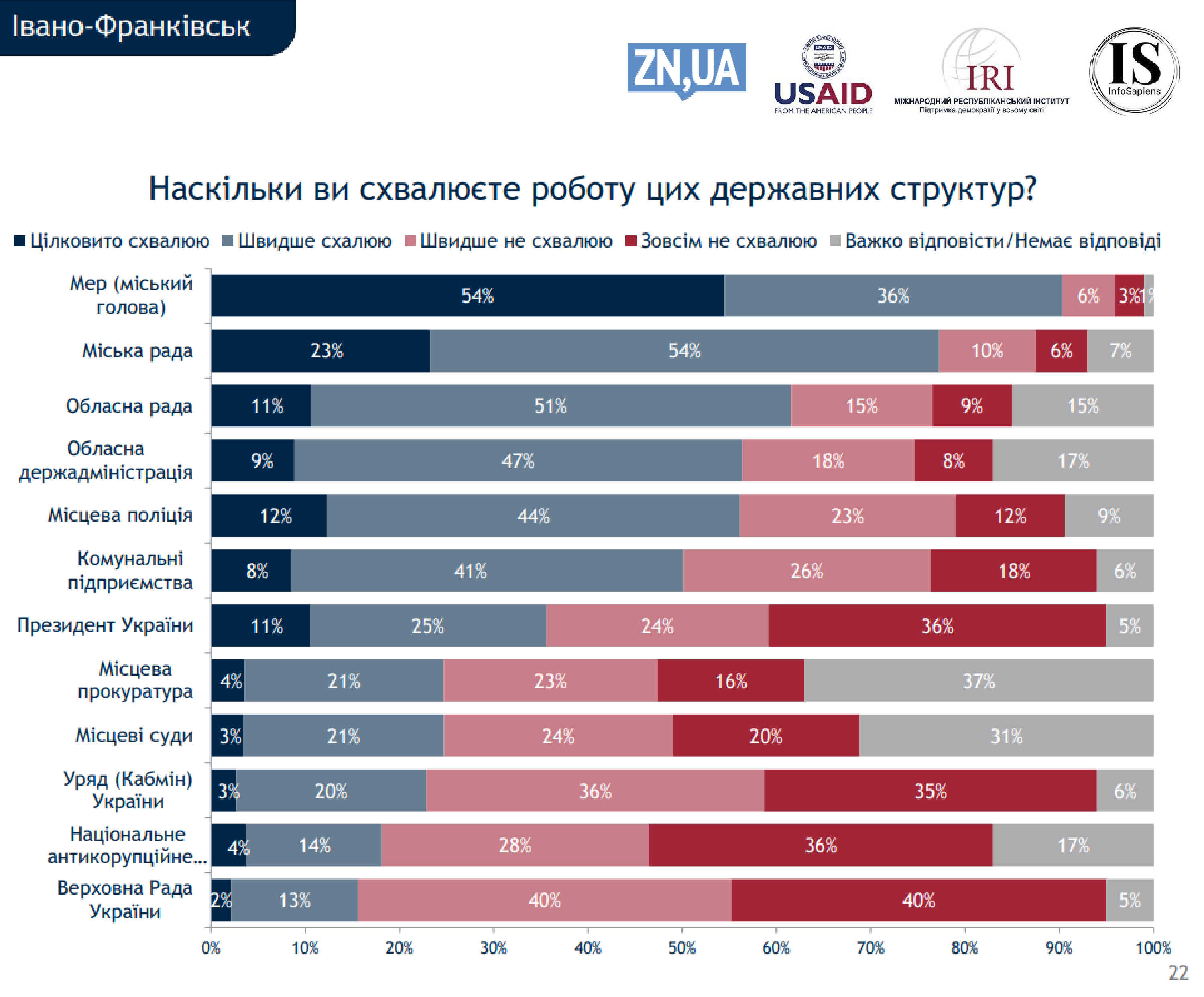 При цьому загалом роботу місцевої поліції цілком схвалюють 12% містян, цілком не схвалюють - також 12%. Роботу комунальних підприємств схвалюють 8% жителів Івано-Франківська, не схвалюють - 18%.