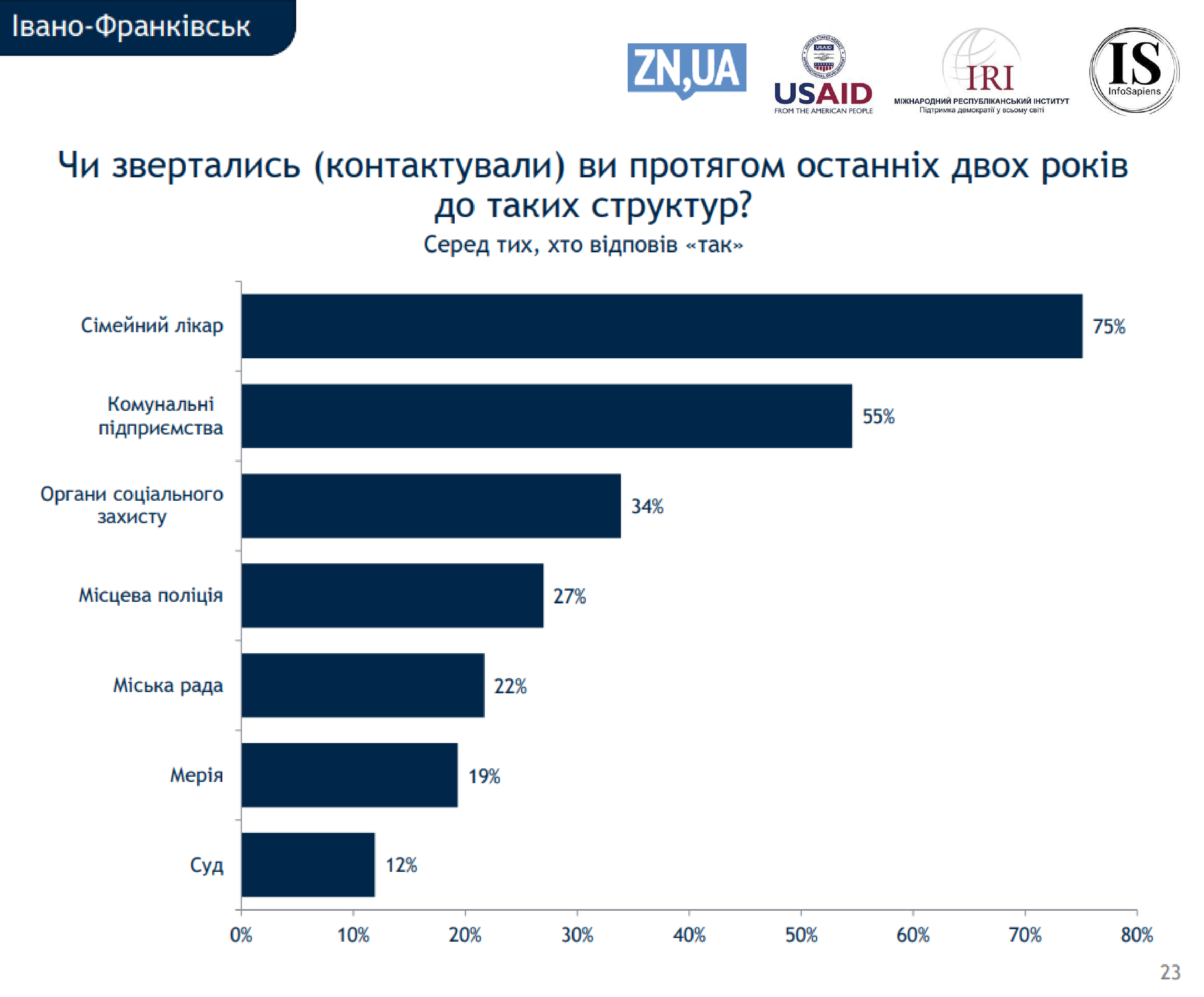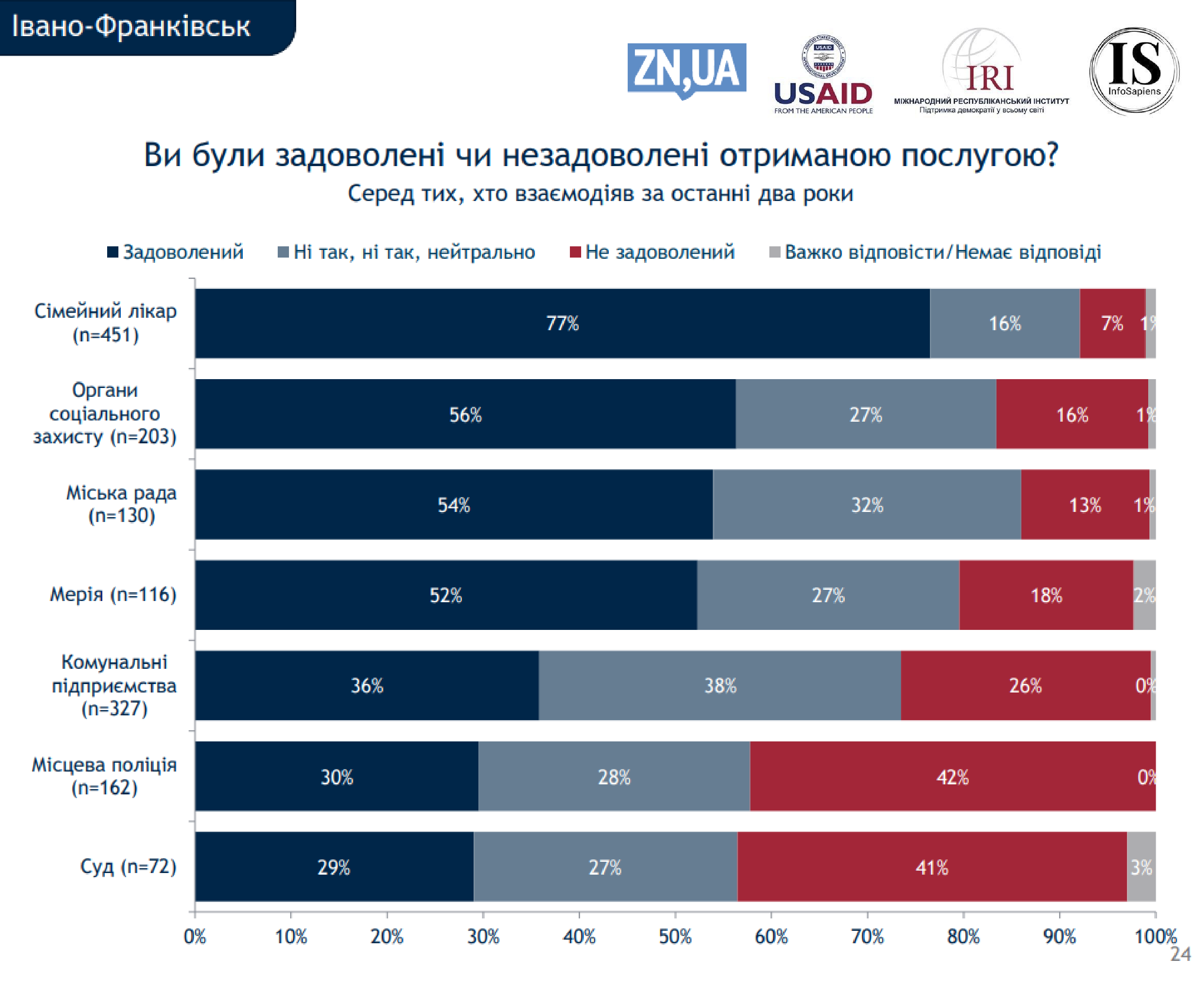 Водночас до суду протягом останніх двох років зверталися 12% жителів Івано-Франківська. З них 29% зазначили, що залишилися задоволеними послугами, а 41% - навпаки.