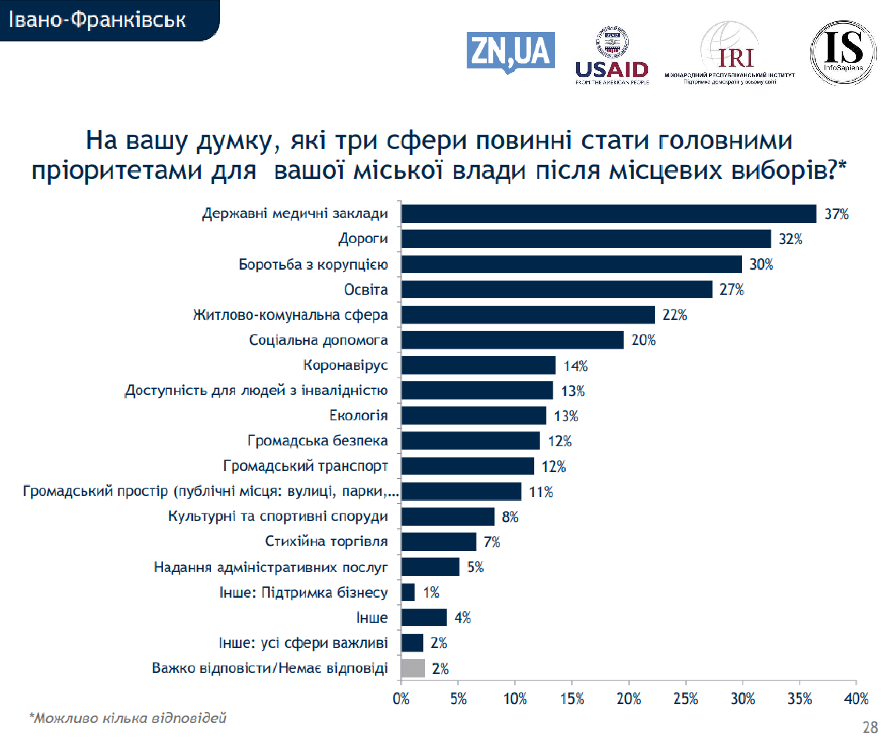 На думку жителів Івано-Франківська головними пріоритетами для місцевої влади після виборів 25 жовтня має стати питання державних медзакладів у місті (переконані 37% містян), ремонт доріг (32%) та боротьба з корупцією (30%). Про це свідчать дані опитування Міжнародного республіканського інституту (IRI), проведеного компанією Info Sapiens.