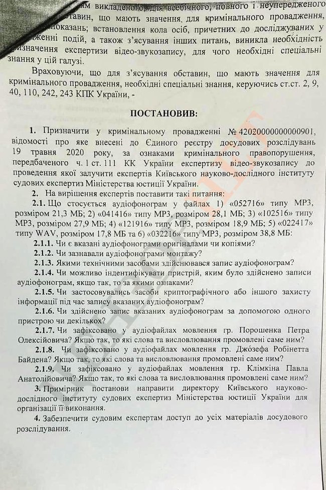 "Слідство хоче з'ясувати, чи зафіксована на аудіофайлі мова громадянина Джозефа Робінетта Байдена. Якщо так, то які слова і висловлювання вимовлені саме ним?" - сказано в постанові.