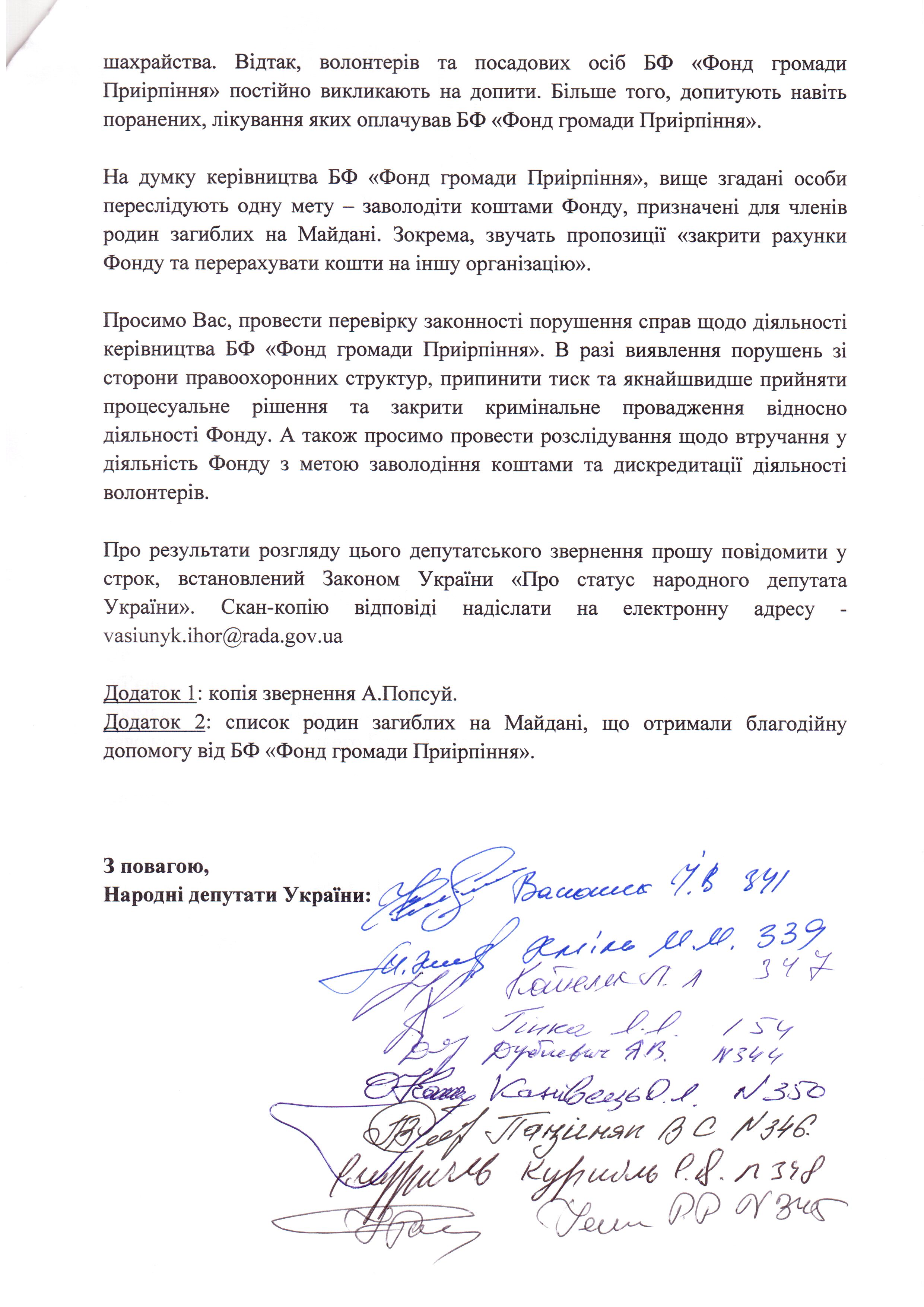Результатом копіткої роботи наглядового комітету стали десятки розісланих у різні інстанції листів з проханням перевірити діяльність фонду. Зі слів Андрія Гука, старшого юриста, адвоката фірми "Марченко Даневич", який нині захищає (на волонтерських засадах) честь і гідність Фонду громади Приірпіння, відомо, що на цей час члени правління центру "Родина Майдан" і особливо керівництво фонду Приірпіння, що акумулює на своїх рахунках кошти для сімей Небесної сотні, зазнають потужного інформаційного й емоційного тиску. Так, на сьогодні фонд перевіряють аж три органи. Основне кримінальне провадження здійснює слідча група Головного слідчого управління в м. Києві - шахрайство в особливо великих розмірах. УБОЗ Київської області перевіряє звернення депутатів В.Ар'єва, О.Бригінця і Л.Ємця. Запит щодо шахрайства надійшов також від прокуратури м. Ірпеня.