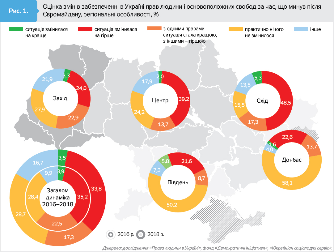 Як і два роки тому, зовсім мало людей (усього 4%) говорять про поліпшення ситуації з правами людини після Євромайдану. Тим часом третина (34%) переконана, що стало значно гірше. Ще третина (29%) жодних змін не помітила. І, загалом, дотримання прав людини в Україні, за п'ятибальною шкалою, ледве дотягує до трійки.