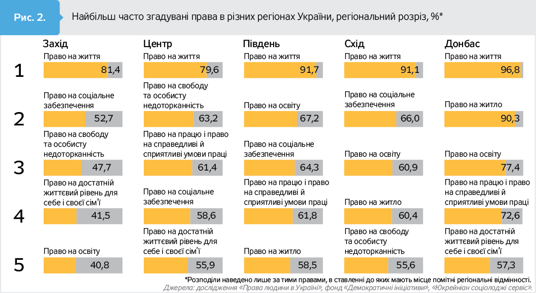 Два роки пріоритетними для українців лишаються соціально-економічні права: право на життя (його відзначили 85% опитаних), а також право на соціальне забезпечення (59%), справедливий суд (58%), працю (56%), житло (55%), освіту (55%), свободу та недоторканність (55%).