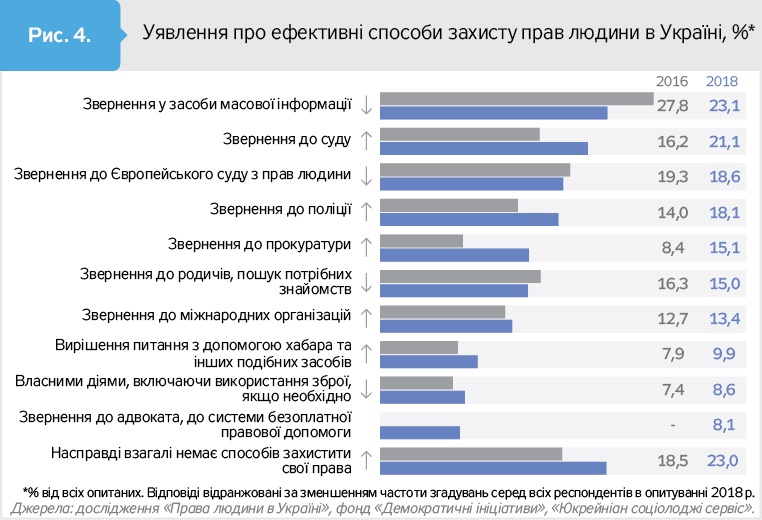 Сумно, але з усіх доступних механізмів захисту своїх прав третина населення обирає… неправові способи, що включають і злочинні методи. Це свідчить про серйозну недовіру населення до влади і механізмів захисту прав людини.