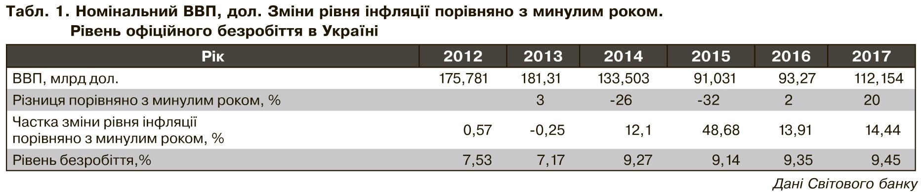Після падіння економіки, практично, вдвічі з 2013 по 2015 р. (зниження ВВП майже вдвічі, зростання інфляції майже на 50%, підвищення рівня безробіття) у 2016–2017 рр. намітився тренд її відновлення (див. табл.1, дані Всесвітнього банку), який триває і в 2018-му, але рівня 2013-го ще не досягнуто й близько.