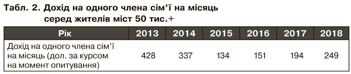 Макроекономічні тренди позначаються на настроях і самооцінці матеріального становища українців. За даними дослідницької компанії Kantar TNS в Україні, середня зарплата українців у містах із населенням 50 тис.+ у доларовому еквіваленті зростає, хоча все ще не досягає рівня 2013-го (див. табл.2).