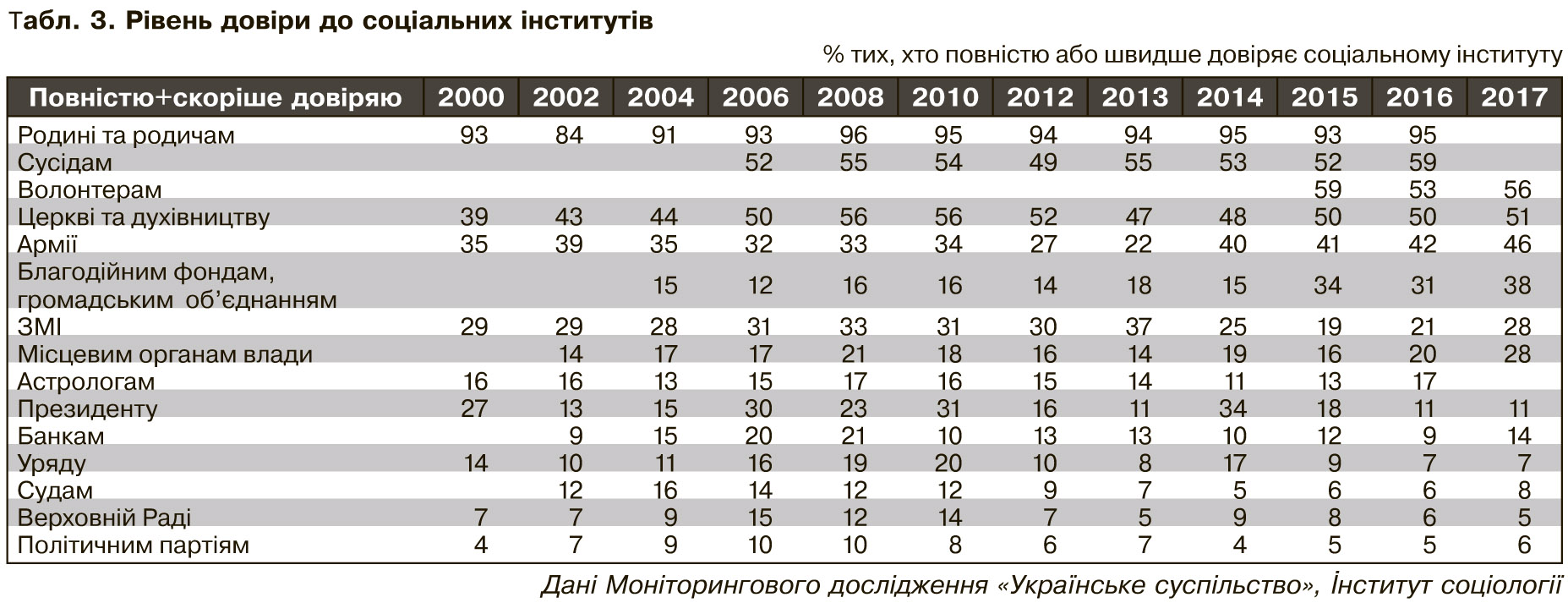 На тлі подій Євромайдану й наступних подій у Криму та на Донбасі зросла й тримається на досить високому рівні довіра до армії, благодійних фондів і громадянських об'єднань, волонтерів. Порівняно з 2000-м, зросла довіра до церкви й духівництва, але у 2017 р. рівень довіри до них був трохи нижчим, ніж у 2010-х (див. табл.3).
