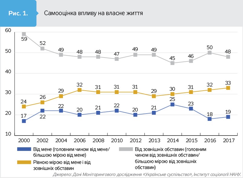При тому що українці незадоволені напрямом руху країни, практично ніхто не відчуває в собі сили вплинути на ситуацію. Усього 20% вважають, що життя залежить від них, не кажучи вже про ситуацію в країні. 48% вважають, що життя залежить від зовнішніх обставин. Ці цифри досить стабільні в останні десятиліття, з невеликими просуваннями у бік зменшення тих, хто вважає, що не може впливати на своє життя. Єдиний виняток - 2014 р., коли 25% почувалися господарями свого життя.