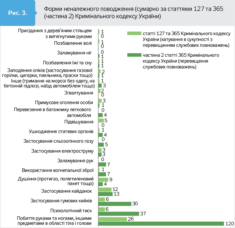 Більшість таких справ кваліфікують як перевищення службових повноважень, пов'язане з насильством (стаття 365, частина 2 ККУ). Проте і їх щороку доходить до суду не більше ніж 15–20.