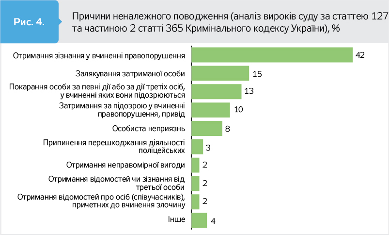 На другому місці серед найбільш поширених причин катування та жорстокого поводження - "покарання особи за певні дії або за дії третіх осіб, у вчиненні яких вони підозрюються" та залякування затриманої особи.