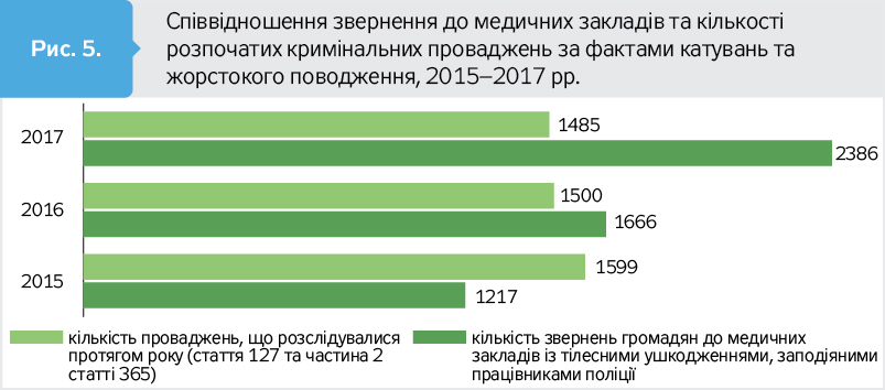 Тільки за офіційними даними закладів охорони здоров'я, 2386 осіб 2017 року звернулися по меддопомогу через травми, завдані працівниками поліції. І з кожним роком таких звернень більшає. Медики фіксують травми голови (30,12% від усіх видів травм), корпуса тіла, кінцівок, множинні травми.