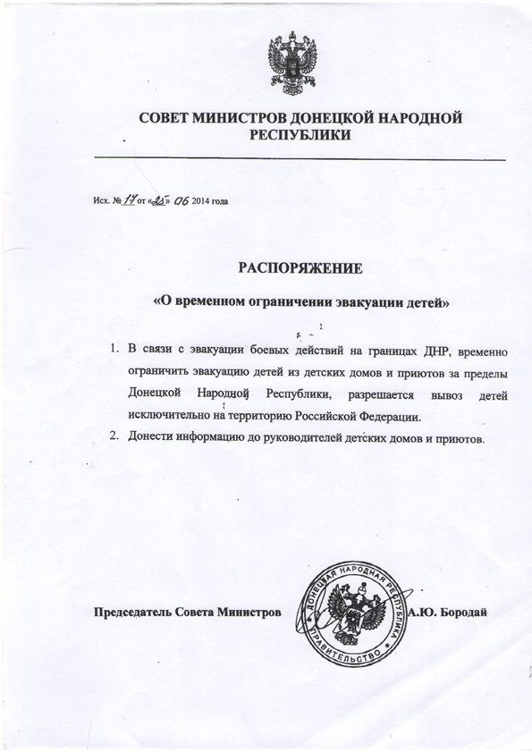 Слід зазначити, що всім співробітникам інтернатів, працівникам місцевих та обласних адміністрацій, волонтерам і добровольцям постійно загрожувала небезпека. Більшість з тих, хто так чи інакше був причетний до вивезення дітей, переживав реальний страх смерті. Чого лишень варте "розпорядження ради міністрів ДНР від 25 червня", за підписом "председателя" Олександра Бородая, про заборону евакуювати дітей з дитбудинків та притулків за межі "ДНР". Можна - виключно в РФ. Із цим папірцем простих службовців та працівників дитячих закладів "ознайомлювали" озброєні "міністри". Терористи ночували в будинках дитини й інтернатах. І міністерства можуть скільки завгодно посилатися на "компетенцію місцевих органів влади", забуваючи сказати про те, що останніх залишили сам-на-сам із надзвичайною ситуацією аж ніяк не регіонального масштабу.