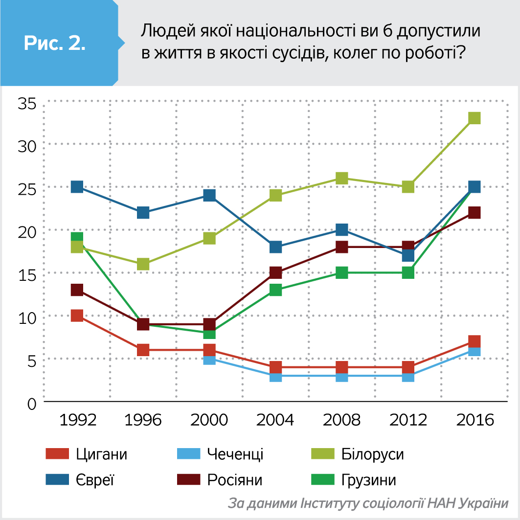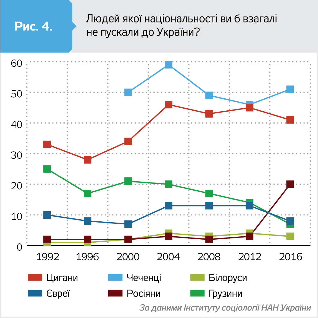 Респондентам пропонувалося оцінити свою готовність допустити у своє життя представників різних етносів та національностей, а також представників інших рас, таких як африканці й китайці. Переважна більшість українських громадян обирала варіант "допустити в ролі туристів, відвідувачів України" і рідше - "як жителів країни, співгромадян". Таким чином респонденти знову й знову підтверджували обережність, поміркованість і схильність довіряти лише близьким та родичам. З усіх пропонованих етносів і національностей "випадали" лише чотири: два - у бік більшої близькості (росіяни і білоруси), два - навпаки, з найбільшими пересторогами. Отже, дві національності, до яких українські громадяни демонстрували стійку пересторогу і небажання взагалі допускати їх у країну, - це чеченці і роми. Важливо наголосити, що таке ставлення виникло не вчора і навіть не позавчора. Воно демонструвало стійку його представленість у суспільній свідомості протягом усіх років самостійності. Нині, згідно з останнім дослідженням Інституту соціології НАН України, яке щойно завершилося, кількість тих, хто не хоче пускати ромів у країну, сягає 41%. Для порівняння: на початку 2000-х цей показник був майже такий самий і навіть на кілька відсотків вищий. Єдиною національною групою, яку не хотіли б пускати в країну ще більше громадян, є чеченці. Як раніше, так і нині за це виступає понад половина опитаних. Причини цього - тема окремого дослідження.