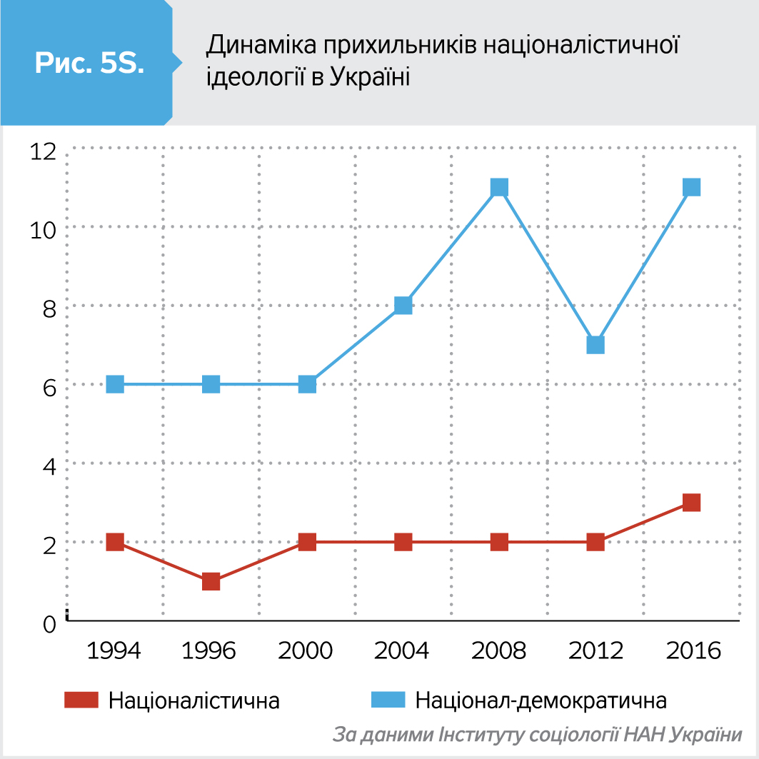 Відсутність зростання впливу етноцентризму серед українських громадян підтверджується, зокрема, кількістю прихильників націоналістичних ідей та її динамікою в умовно "домайданівський" період і після нього. Якщо 20 років тому кількість прихильників націоналістичної ідеології становила 2% і залишалася на цьому рівні всі наступні роки, то нині, майже через три роки після початку Євромайдану, становить 3%. Відтак говорити про зростання ксенофобії, як і про зростання націоналізму та етноцентризму в масовій свідомості, підстав немає. Навіть попри намагання деяких сил примусити глядача всередині країни і за її межами повірити у протилежне завдяки ефектним акціям під телекамери, що їх вони проводять на тлі найбільш резонансних заходів і подій.