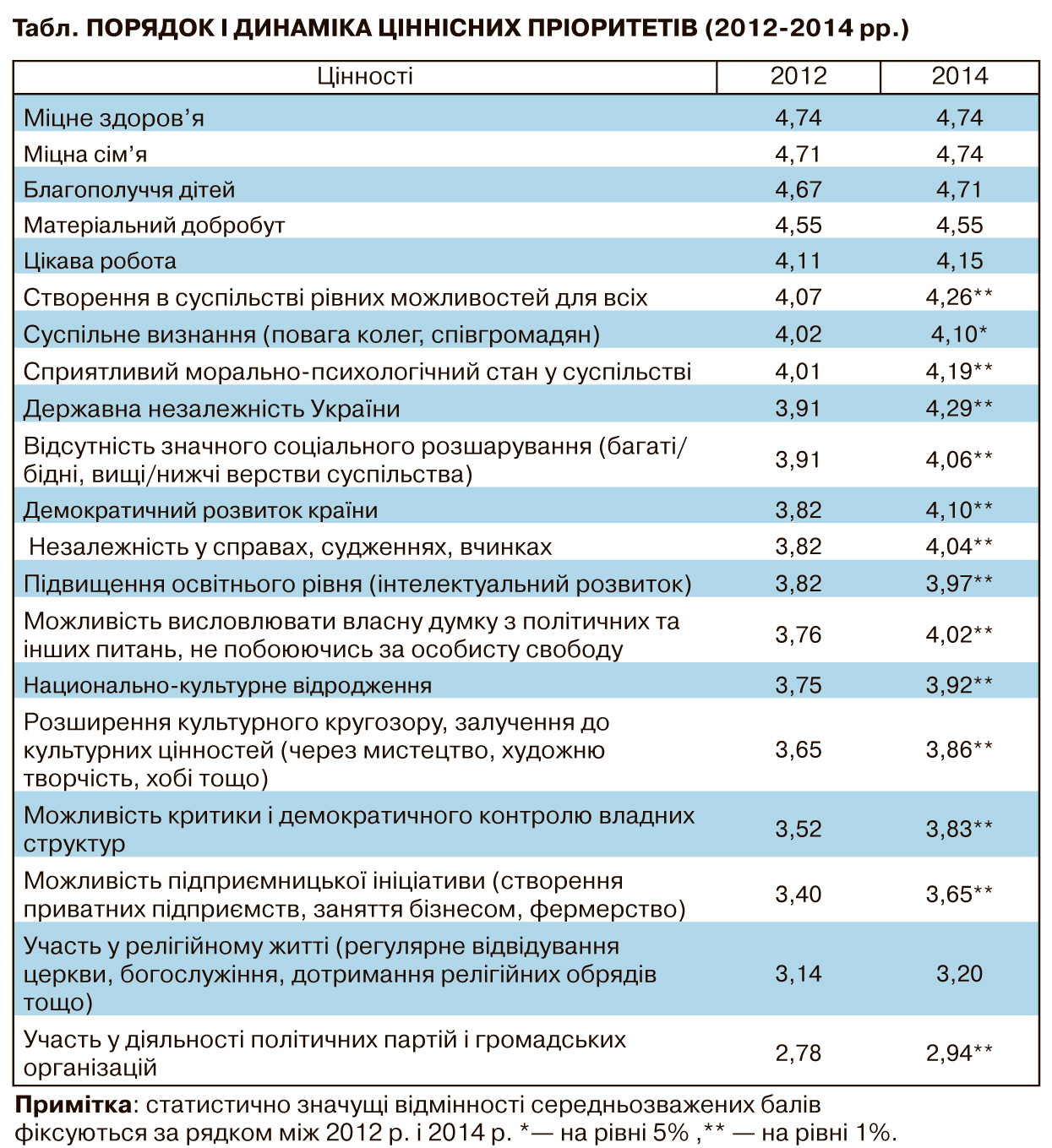 - У таблиці наведено список цінностей та їхні індекси (середньозважені бали), що засвідчують ієрархічний порядок і динаміку ціннісних пріоритетів у ментальності громадян країни за період 2012–2014 рр. Респондентам пропонувалося оцінити важливість особисто для себе певного списку цінностей за п'ятибальною шкалою, де 1 бал означає "зовсім не важливо", 2 - "скоріше не важливо", 3 - "важко відповісти, важливо чи ні", 4 - "скоріше важливо", 5 балів - "дуже важливо".