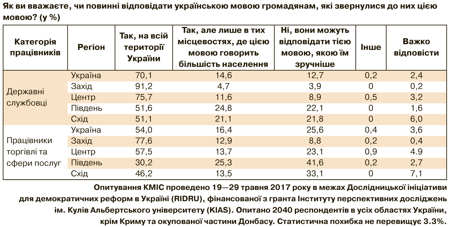Ще більш показовими є відповіді на чіткі запитання про те, "чи повинні відповідати українською мовою громадянам, які звернулися до них цією мовою", державні службовці й "працівники торгівлі та сфери послуг" (ділянок, які нині є переважно приватними). Щодо держслужбовців, то 2017 року аж 70% (на 9% більше, ніж 2014-го) відповіло: "Так, на всій території України", а ще 15% - "Так, але лише в тих місцевостях, де цією мовою говорить більшість". Тільки 13% підтримали думку, що чиновники "можуть відповідати тією мовою, якою їм зручніше" (див. таблицю). Навіть у східних та південних регіонах понад половина респондентів визнала загальнонаціональний обов'язок чиновників відповідати державною мовою і менш як чверть погодилася, що ті можуть вибирати мову спілкування з громадянами на свій розсуд. Мало того, за останні три роки радикально зросла підтримка позиції, що поважати мовний вибір громадян повинні також надавачі послуг. Аж 54% (проти 35% 2014-го) сказали, що ті мають відповідати українською по всій Україні, й лише 26% - що так, як зручніше. На Сході й Півдні країни за обов'язковість української висловилася понад третина респондентів, що трохи менше, ніж прибічників традиційної "зручності", але водночас аж удвоє більше, ніж було три роки тому.