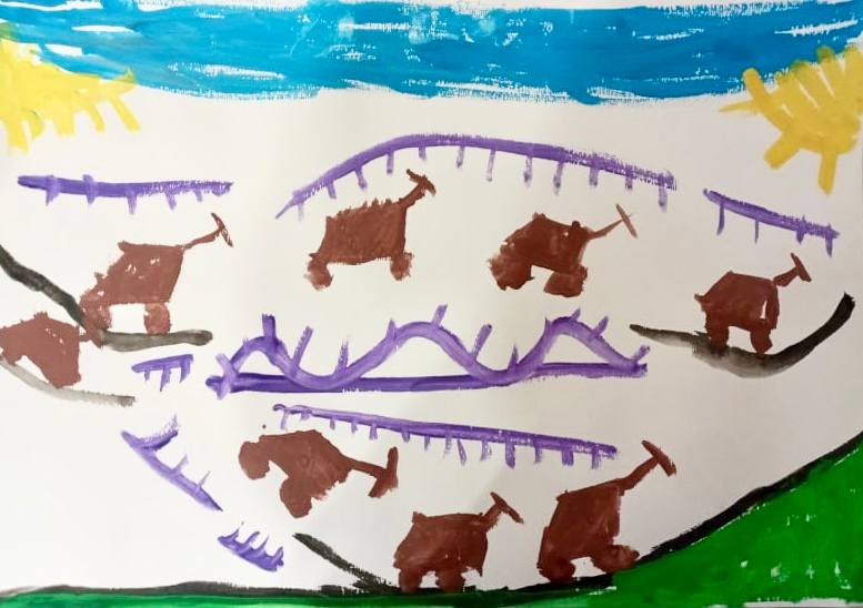 П’ятилітній хлопчик із Києва, чия родина виїхала майже одразу після початку війни, був трошки наляканий сиреною, вибухами. На його малюнках дуже добре видно трансформацію. Спочатку він малював обгорілі дерева, в які вдарила блискавка. Під кінець — великий розлогий дуб, схожий на людину.