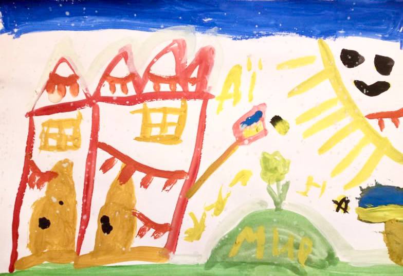 Тепер же в малюнках дітей із Києва, Одеси, Харкова, з будь-якого куточка України — будинки, що палають, падають бомби, блокпости, вертольоти, літаки з дуже чіткою автентичністю. Прапор України. І замальований чи прострелений прапор Росії як візуалізація того, чого хоче дитина — щоб Україна перемогла.