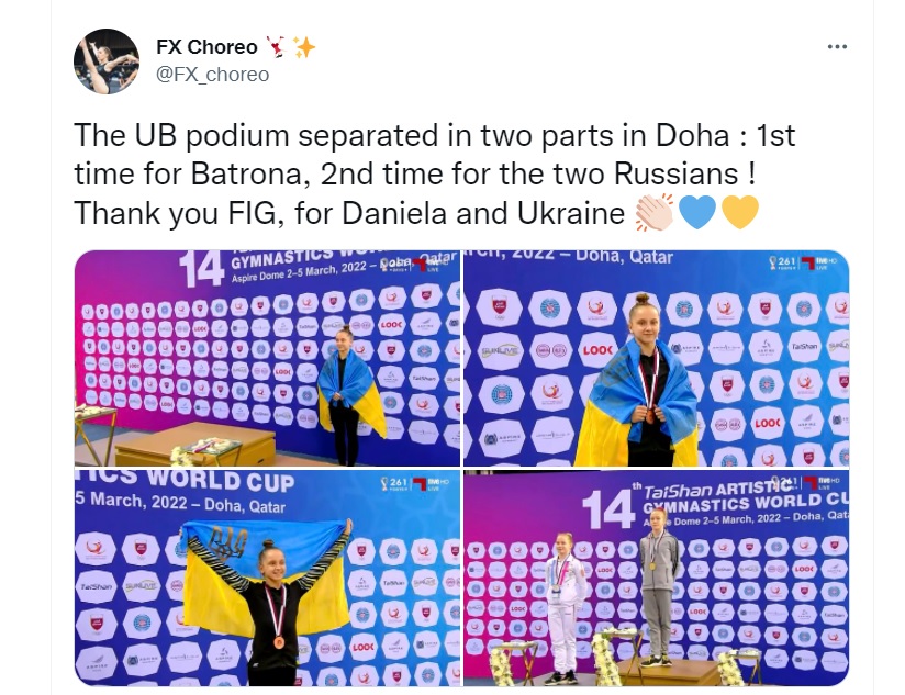 Українка посіла третє місце у вправах на різних брусах на етапі Кубка Світу в Досі, а перші два місця оказалися за росіянками Вікторією Лістуновою та Марією Мінаєвою. Під час нагородження Батрона вирішила піднятися на п'єдестал окремо від них.