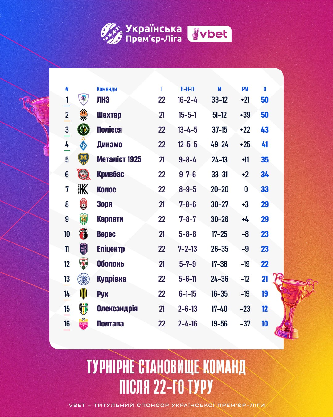 З 3 по 6 квітня відбулися матчі 22-го туру української Прем'єр-ліги з футболу сезону-2025/26.
