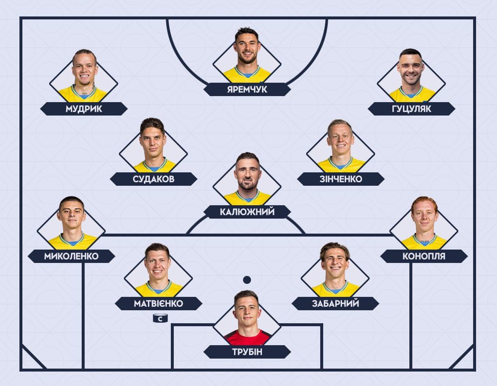 Україна: Трубін, Миколенко, Матвієнко, Забарний, Конопля, Калюжний, Зінченко, Судаков, Мудрик, Гуцуляк, Яремчук