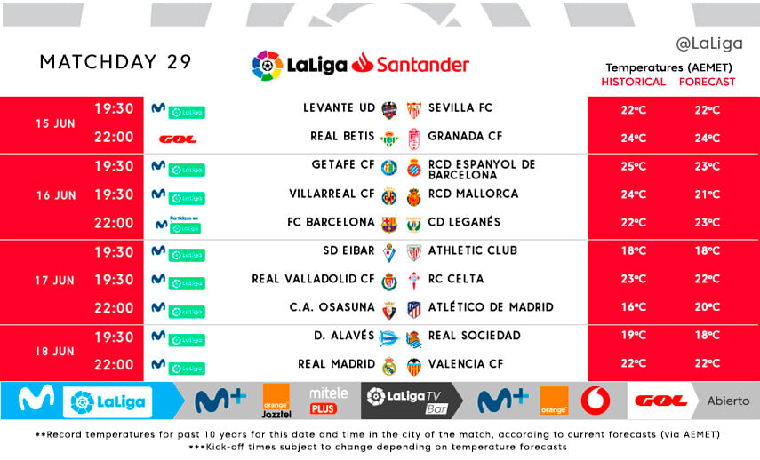 Представлено розклад матчів 28-го і 29-го турів іспанської Ла Ліги, яку буде відновлено 11 червня після паузи, пов'язаної з пандемією коронавірусу.