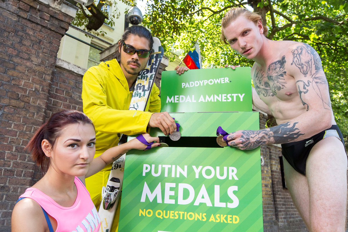 Британська букмекерська контора Paddy Power встановила біля посольства Росії у Великобританії коробку для повернення медалей, закликавши таким чином російських спортсменів повернути нагороди, здобуті нечесним шляхом.