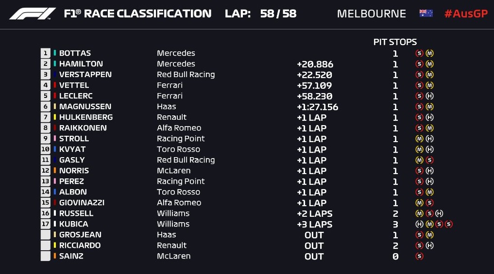 Друге місце зайняв напарник по команді фінна, британець Люіс Хемілтон. Трійку замкнув Макс Ферстаппен з "Ред Булла". У кваліфікації Боттас зайняв друге місце.