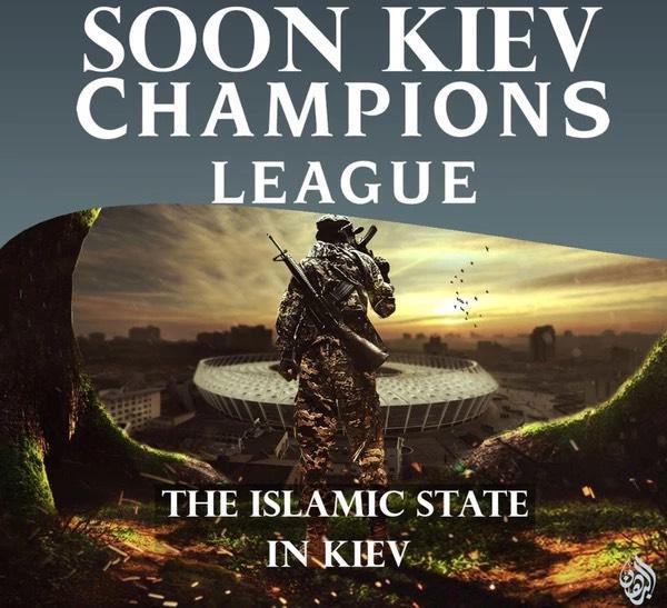 Бойовики ІГІЛ поширили нові плакати з погрозами, які на цей раз спрямовані на фінал Ліги чемпіонів у Києві. Як повідомляє британське видання "The Sun", в закритих групах терористів в соціальній мережі Telegram з'явилися плакати із закликами здійснювати напади в центрі міста. На плакаті зображено терорист із зброєю в Києві на фоні НСК "Олімпійський".