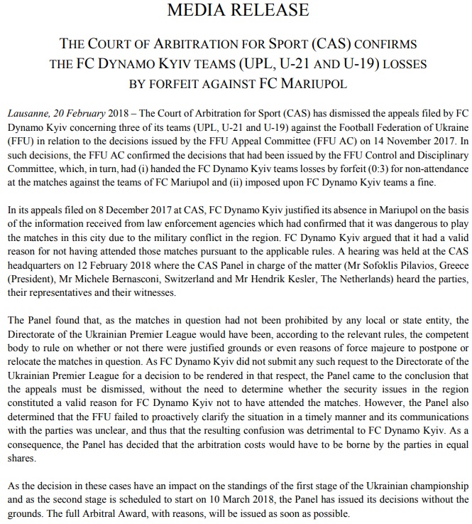 Вчора, 19 лютого стало відомо про те, що CAS відхилив всі претензії "Динамо" до Федерації футболу України по "маріупольській справі".