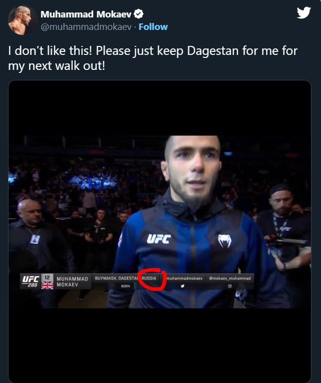 На плашці під час виходу бійця на бій було написано "Росія". Мокаєв при цьому погано ставиться до росіян і проживає у Великій Британії.