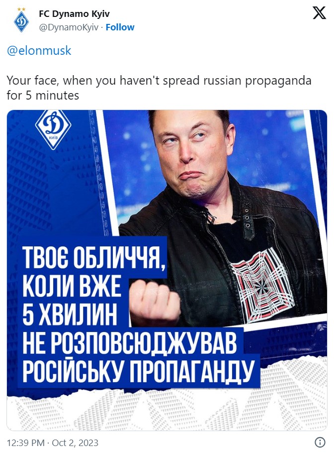 "Динамо" відповіло фото самого Маска та коментарем: "Твоє обличчя, коли вже п'ять хвилин не поширював російську пропаганду".