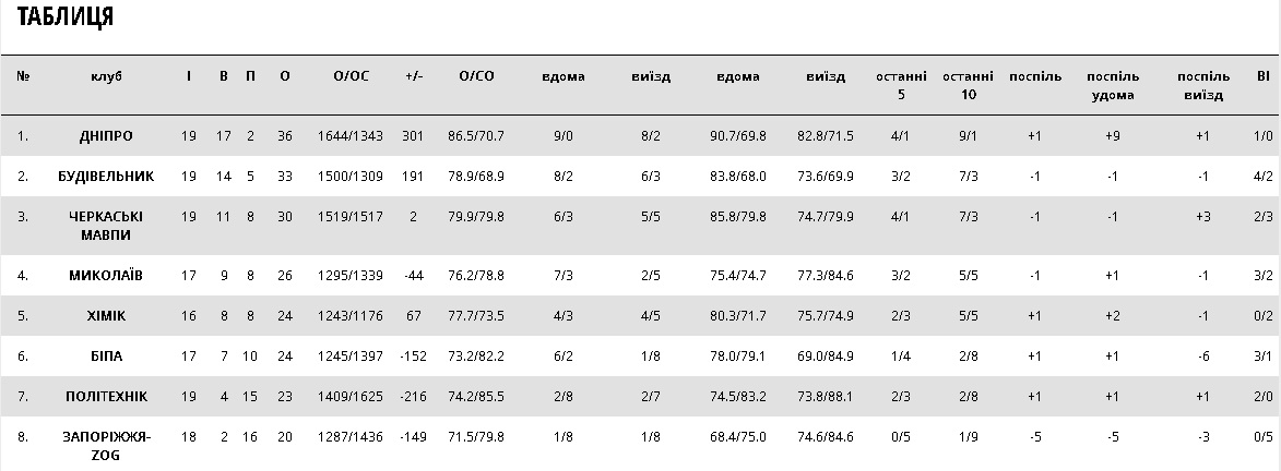 Після зіграних матчів "Дніпро" залишився лідером у турнірній таблиці баскетбольної Суперліги, випереджаючи "Будівельник" на три очки.