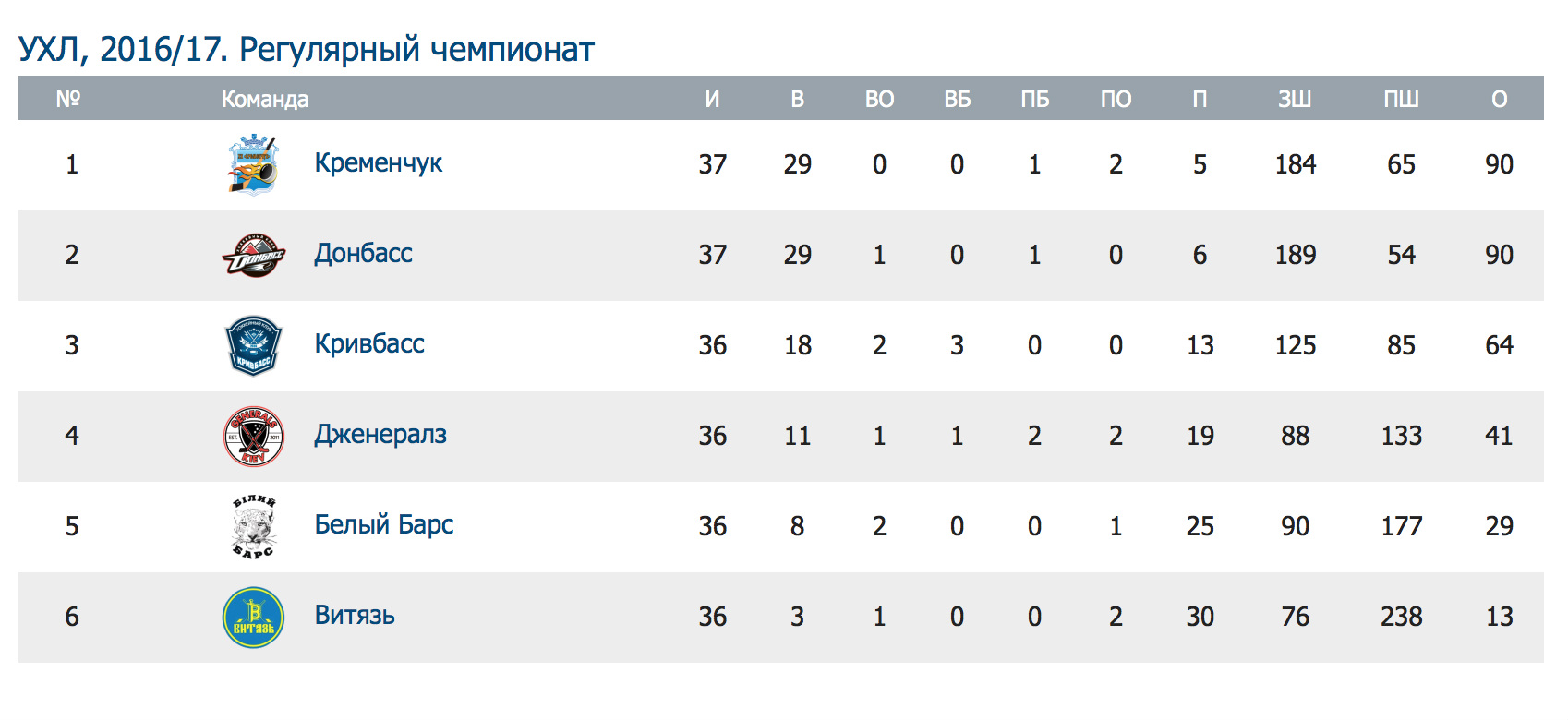 Таким чином, "Донбас" і "Кременчуг" продовжують ділити лідерство в турнірній таблиці УХЛ. Абсолютним аутсайдером чемпіонату України є харківський "Витязь".