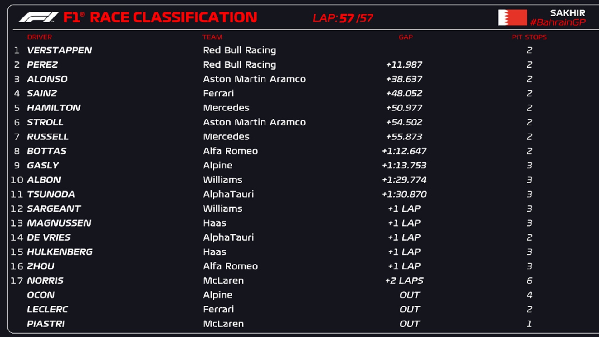 Перемогу здобув чинний чемпіон Ф-1 Макс Ферстаппен із команди "Ред Булл". Його партнер Серхіо Перес із відставанням понад 11 секунд фінішував другим, а трійку на подіумі замкнув представник "Астон Мартін" Фернандо Алонсо.