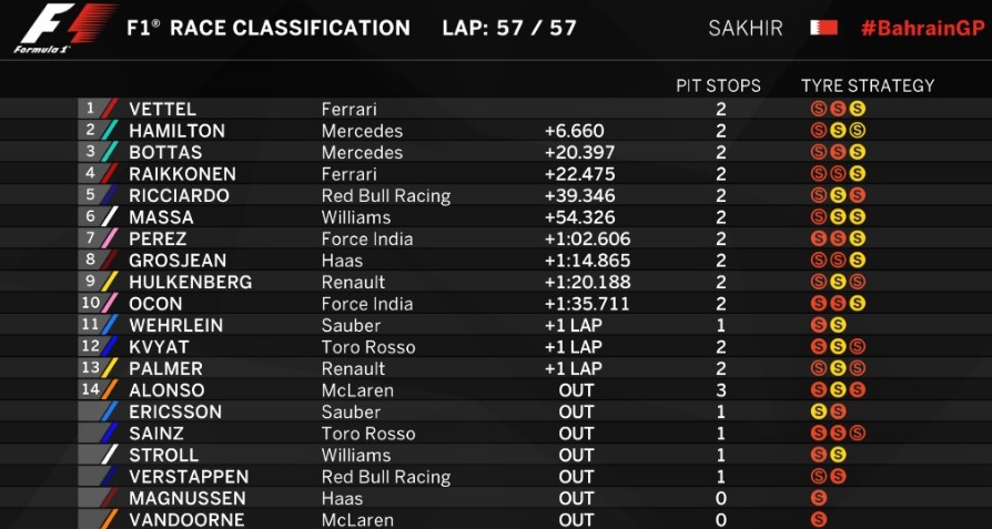 Сьогодні, 16 квітня, відбулася третя гонка сезону Формули-1 - Гран-прі Бахрейну. Перемогу святкував Себастьян Феттель з "Феррарі", який впевнено обійшов фаворита в особі Льюїса Хемілтона.
