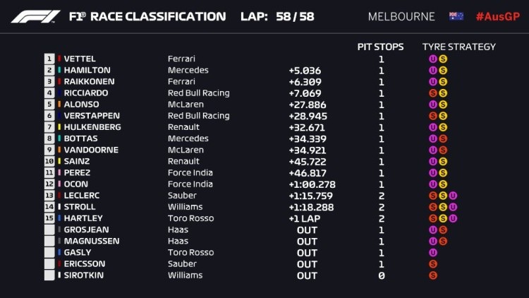 Гонка почалася очікуваним лідерством Льюїса Хемілтона, який поступово почав йти у відрив. Британець втратив лідерство за віртуальною машиною безпеки, коли йому довелося гальмувати, а Феттель відправився на піт-стоп. Обгони в Мельбурні є не надто частим явищем, тому гонщику "Феррарі" вдалося утримати лідерство, а в трійку крім Хемілтона увійшов ще один представник Скудерії Кімі Райкконен.