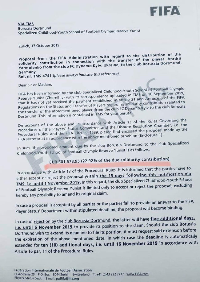 Організація повідомила німецькому клуу про те, що необхідно виплатити спеціалізованій дитячо-юнацькій школі олімпійського резерву з футболу "Юність" заборгованість у розмірі 301 578,95 євро.