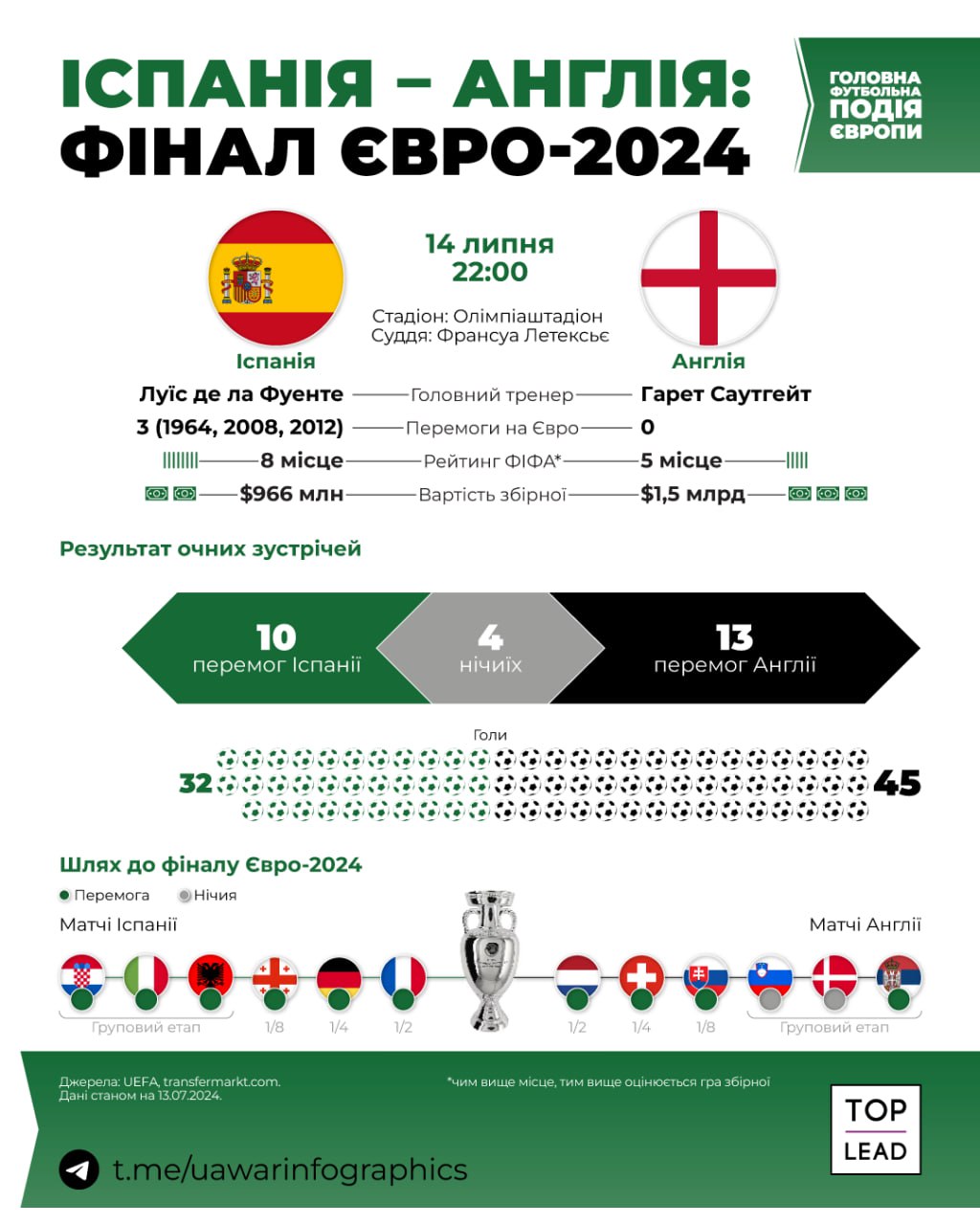 Нагадаємо, саме сьогодні, 14 липня, відбудеться фінальний матч чемпіонату Європи-2024 з футболу, у якому зіграють команди Іспанії та Англії. У прямому ефірі трансляція фіналу буде доступна на медіасервісі MEGOGO, але для цього потрібна передплата. Крім того, безкоштовно вирішальний матч покажуть регіональні телеканали "Суспільного" у цифровому ефірі T2, кабельних мережах та IPTV (крім OTT). Поєдинок проходитиме у столиці Німеччини, Берліні, на Олімпійському стадіоні. Стартовий свисток пролунає о 22:00 за київським часом.