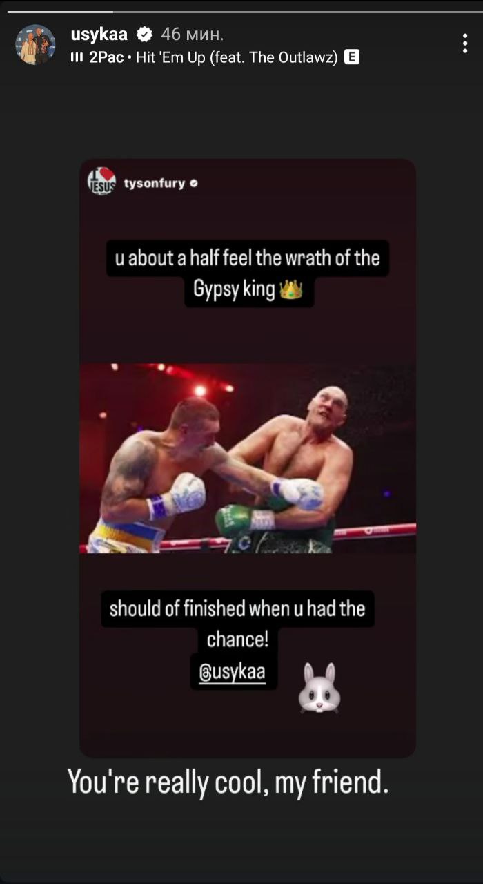 Ексчемпіон світу у суперважкій вазі Тайсон Ф'юрі (34-1-1, 24 КО) та чемпіон WBC, WBA, WBO, IBO Олександра Усика (22-0, 14 КО) поспілкувалися між собою у stories Instagram.