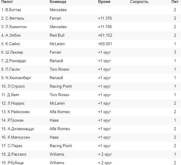 У гонці на перше місце вийшов Боттас, який лідирував більшу частину дистанції. Фінн в підсумку здобув перемогу, а в топ-3 увійшли Себастьян Феттель і Льюїс Хемілтон з "Мерседеса".