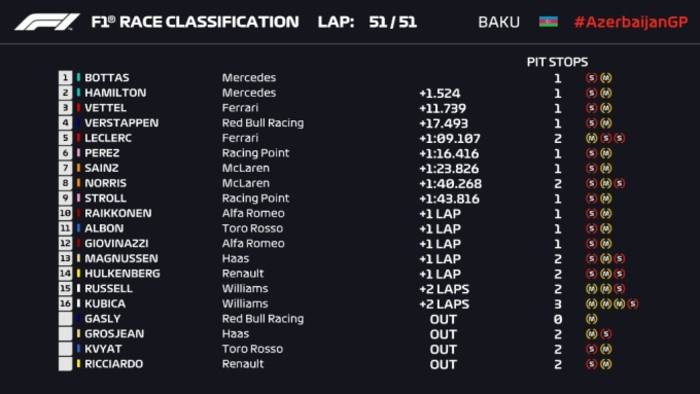 В особистому заліку Боттас вийшов на перше місце, набравши 87 очок. Хемілтон відстає від напарника на один пункт, а в трійці - Феттель (52).