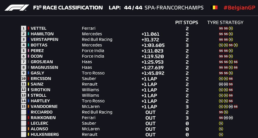 Пілот "Феррарі" Себастьян Феттель здобув перемогу на черговому етапі чемпіонату Формули-1 - Гран-прі Бельгії. Друге місце дісталося пілоту "Мерседеса" Льюїсу Хемілтону, третім фінішував гонщик "Ред Булла" Макс Ферстаппен.