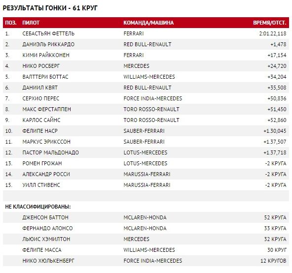 Переможцем Гран-прі став Себастьян Феттель, який і починав гонку з поул-позишн. Слідом за ним до фінішу прийшов Даніель Ріккардо з "Ред Булл", а третім став Кімі Райкконен. "Це одна з моїх кращих гонок", - підкреслив після фінішу Феттель.
