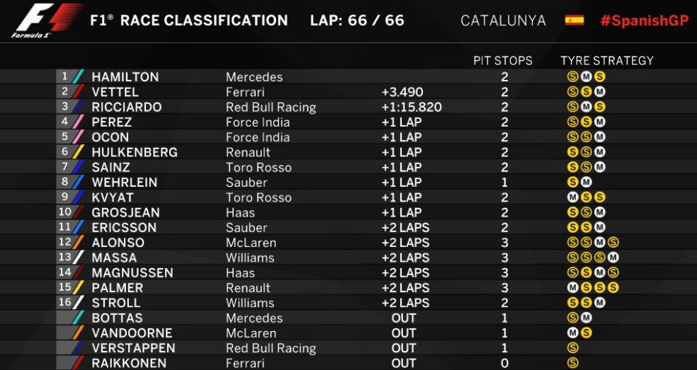 Сьогодні, 14 травня, відбулася чергова гонка сезону Формули-1 - Гран-прі Іспанії. Перемогу святкував Льюїс Хемілтон з "Мерседеса", який стартував з поула і зумів виграти боротьбу у Себастьяна Феттеля з "Феррарі".