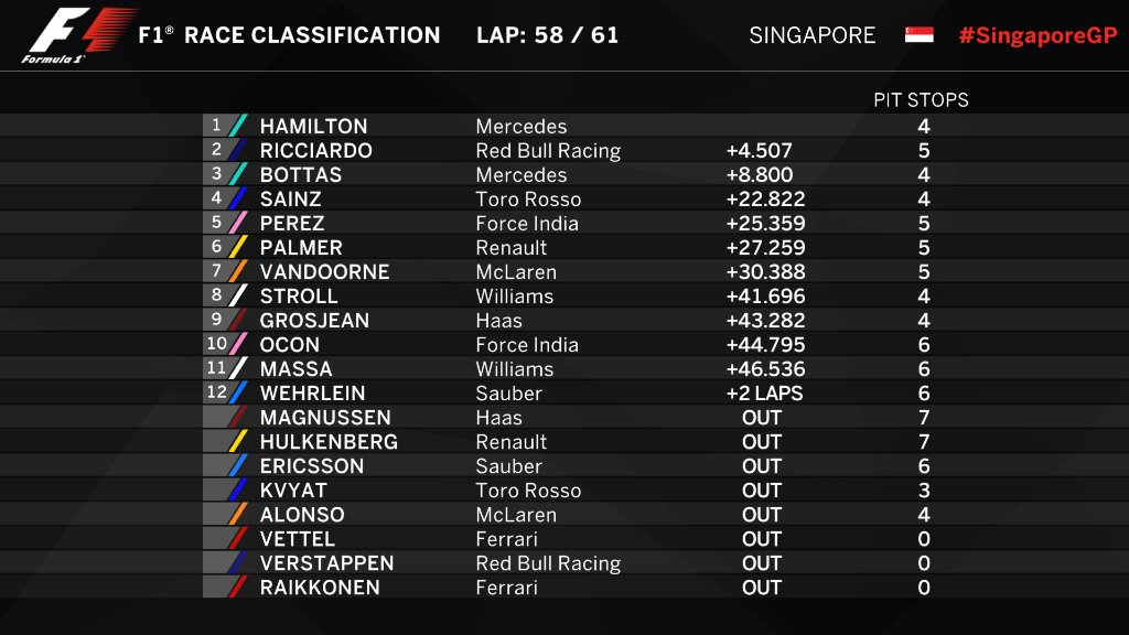 Лідером став саме Хемілтон, який не втратив перемогу до завершення гонки. Після цього Гран-прі загальний відрив Хемілтона від Феттеля зріс до 28 очок.