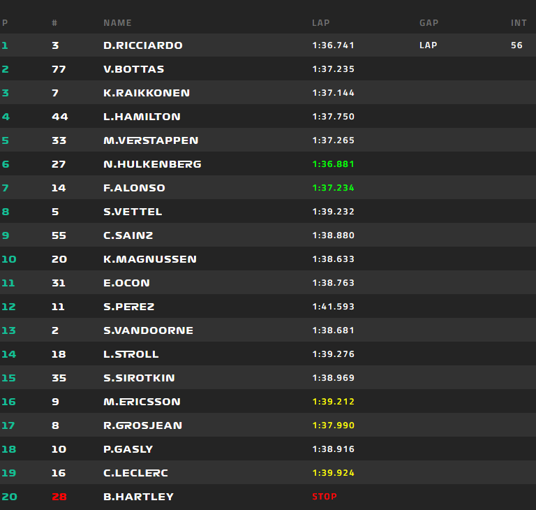 За перше місце довгий час боролися Себастьян Феттель і Валттері Боттас, але виїзд сейфіті-кар після аварії П'єра Гаслі і Брендона Хартлі змінив розклад перегонів.