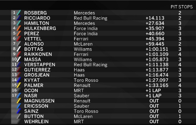 Саме Росберг стартував першим і зумів зберегти позицію, тоді як його головний конкурент, напарник і лідер сезону Льюїс Хемілтон стартував з останнього місця через штрафи за кілька замін деталей двигуна. Тим не менш, це не завадило британцеві не тільки потрапити в зону очок, але і зайняти третє місце. Другим став австралієць Даніель Ріккардо з "Ред Булла".