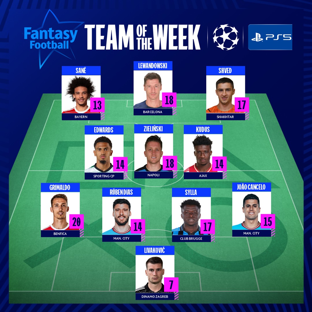Символічна збірна 1-го туру ЛЧ: Лівакович ("Динамо" Загреб), Жоау Канселу ("Манчестер Сіті"), Сілла ("Брюгге"), Рубен Діаш ("Манчестер Сіті"), Грімальдо ("Бенфіка"), Кудус ( "Аякс"), Зелінський ("Наполі"), Евдвардс ("Спортінг"), Сані ("Баварія"), Швед ("Шахтар"), Левандовський ("Баварія").