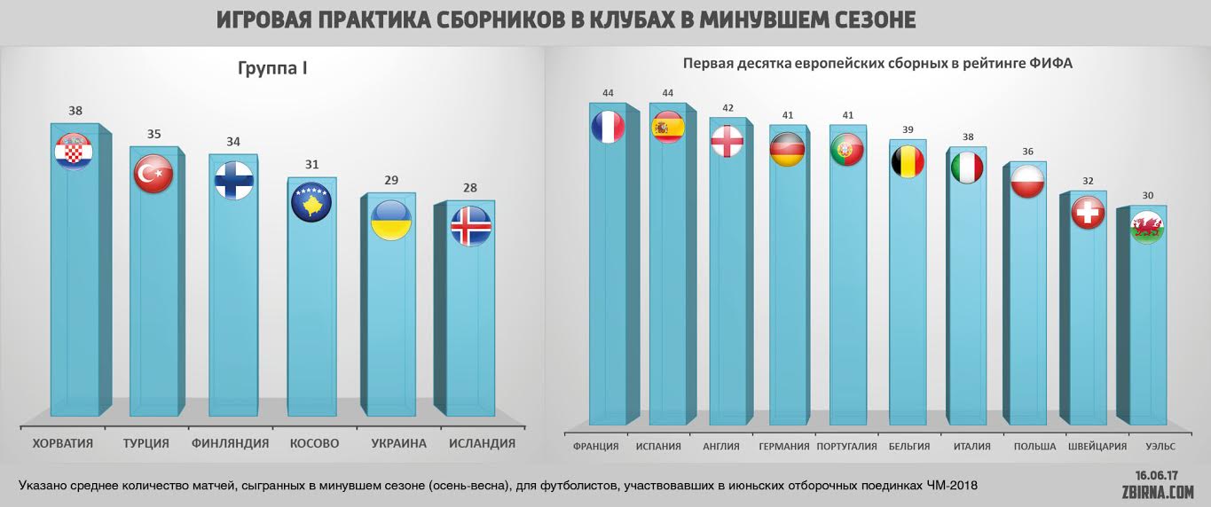 Підопічні Андрія Шевченка в середньому зіграли 29 матчів у минулому сезоні, косовари - 31, фіни - 34, турки - 35, хорвати - 36. Тільки футболісти збірної Ісландії в середньому грали менше українців - 28 матчів.